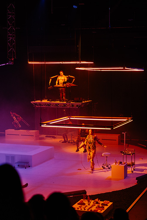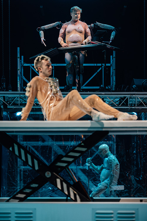 ETERNAL DAWN is a full-length music theatre project on the subject of transhumanism by Alexander Schubert, co-produced and performed by the Decoder Ensemble, in collaboration with a wide interdisciplinary artistic and scientific team. In a futuristic setting, performers act as a group of individual cyborgs with the help of technical body extensions, bio-modifications and sensors. These actions and interactions determine both the theatrical content of the piece and the musical form of the work.